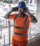 50% recycled polyester/50% polyester. Conforms to EN ISO 20471: 2013 + A1: 2016 class 2. RIS-3279-TOM (orange only). Soft touch, wicking micro mesh. UPF 40+ protection. Contrast ribbed collar. Taped neck. Two contrast button placket. Two reflective bands on front, back and one over each shoulder. Side vents. Twin needle sleeves and hem. Branded tab on lower left side seam.