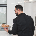 Men's jacket featuring a breathable fabric blend and mesh panels. The statement asymmetric front with hidden fastenings gives a functional design a modern and subtle twist. The sportswear-style elasticated centre back provides a comfortable and flexible fit, which is exactly what busy chefs need as they move around the kitchen.