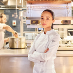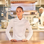 Women's jacket featuring a breathable fabric blend and mesh panels. The statement asymmetric front with hidden fastenings gives a functional design a modern and subtle twist. The sportswear-style elasticated centre back provides a comfortable and flexible fit, which is exactly what busy chefs need as they move around the kitchen.